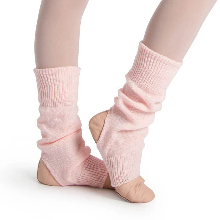 Our basic children's knee-length stirrup legwarmer in soft acrylic knit is an essential item for warm-up and stretch class. The stirrup of the legwarmer hooks underneath the arch of the foot and can be worn with bare feet or comfortably over a ballet or jazz shoe. The top of the ankle warmer can be folded down for the desired length and the rib cuff detail is the perfect finish.