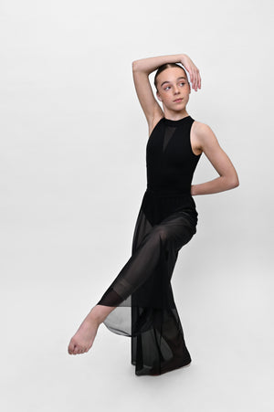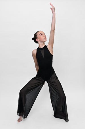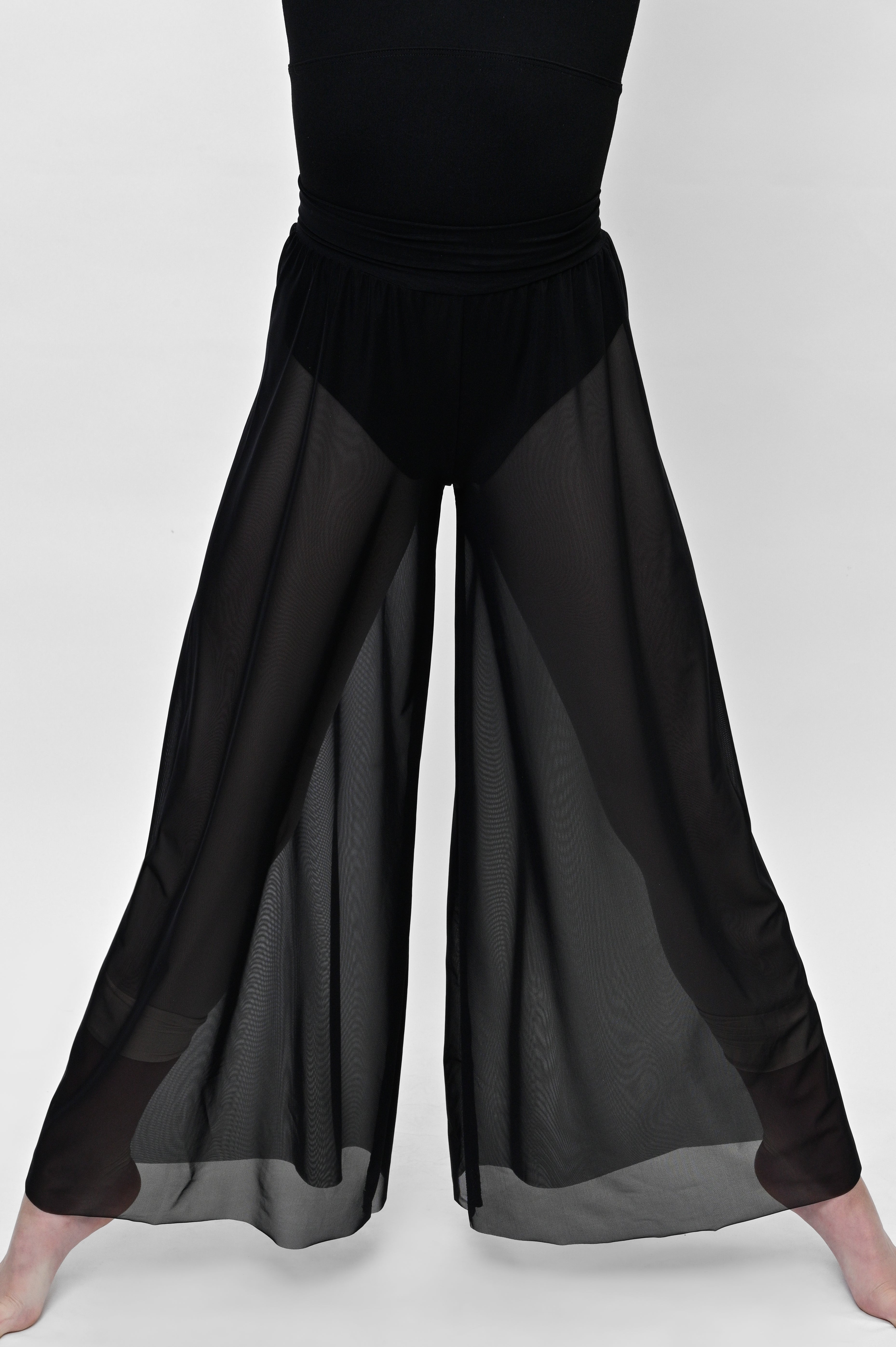 Elevate your performance with these Mesh Contemporary Pants. Designed for freedom, style, and effortless movement. Featuring a sleek straight high-waisted band and a wide leg silhouette, they deliver both comfort and drama. The sheer mesh fabric flows with every step and extension, creating stunning lines on stage while keeping you cool and confident in class or rehearsal.