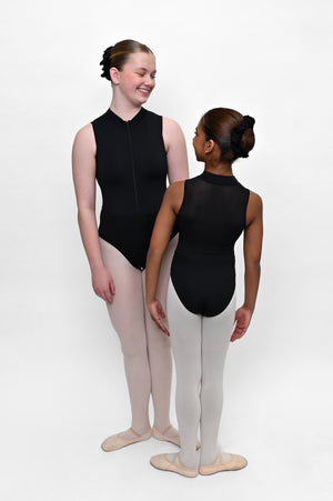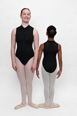 The Elara Leotard embodies elegance with a touch of mystery. Designed with a sleek high neckline and front zip, this style offers a modern silhouette that’s both flattering and functional. The plain black power mesh back adds sophistication and breathability, creating a timeless look that transitions seamlessly from studio to stage.