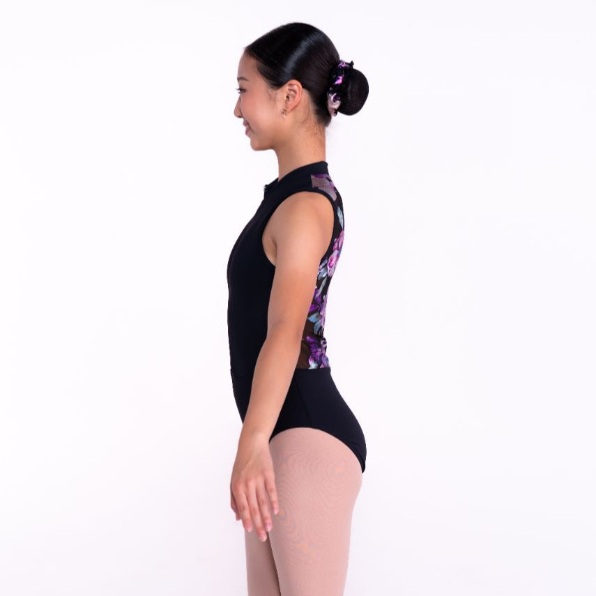 Step into elegance with the Florence Leotard. Featuring a sleek high neckline and front zip design, this piece balances modern structure with romantic detail. The back blooms with a stunning floral print, making it a statement both on stage and in class.