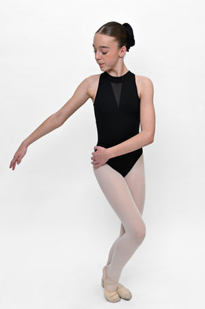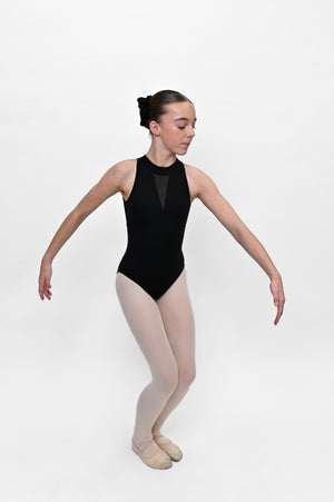 A standout staple for every dancer’s wardrobe, the Gracie Leotard blends bold structure with elegant mesh detailing. The high neckline and plunging mesh V-panel create a striking silhouette from the front, while the back reveals a sophisticated keyhole cut-out framed by mesh and a secure clasp closure. Designed in a premium stretch fabric for a flawless fit and lasting comfort.
