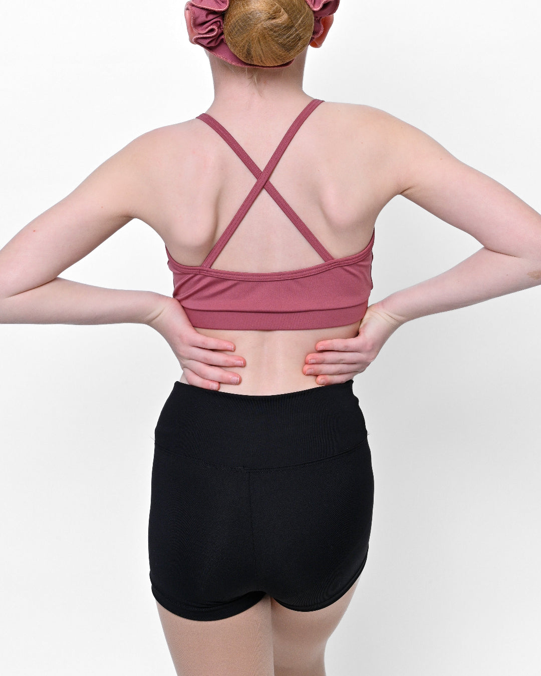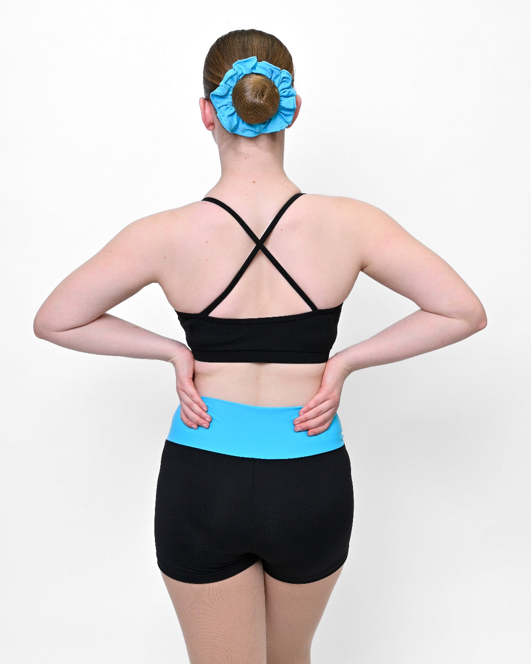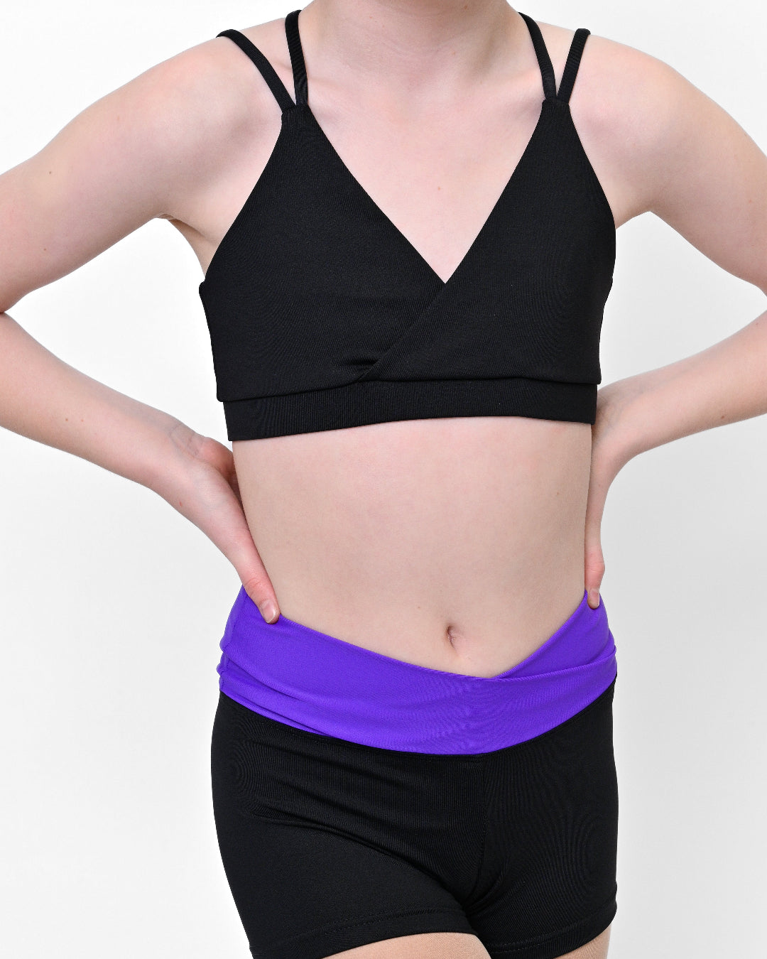 Stand out in style with our High-Waisted Crossover Band Shorts. The bold contrast waistband and flattering crossover design make these a dancewear must-have for class, rehearsal, and performance.