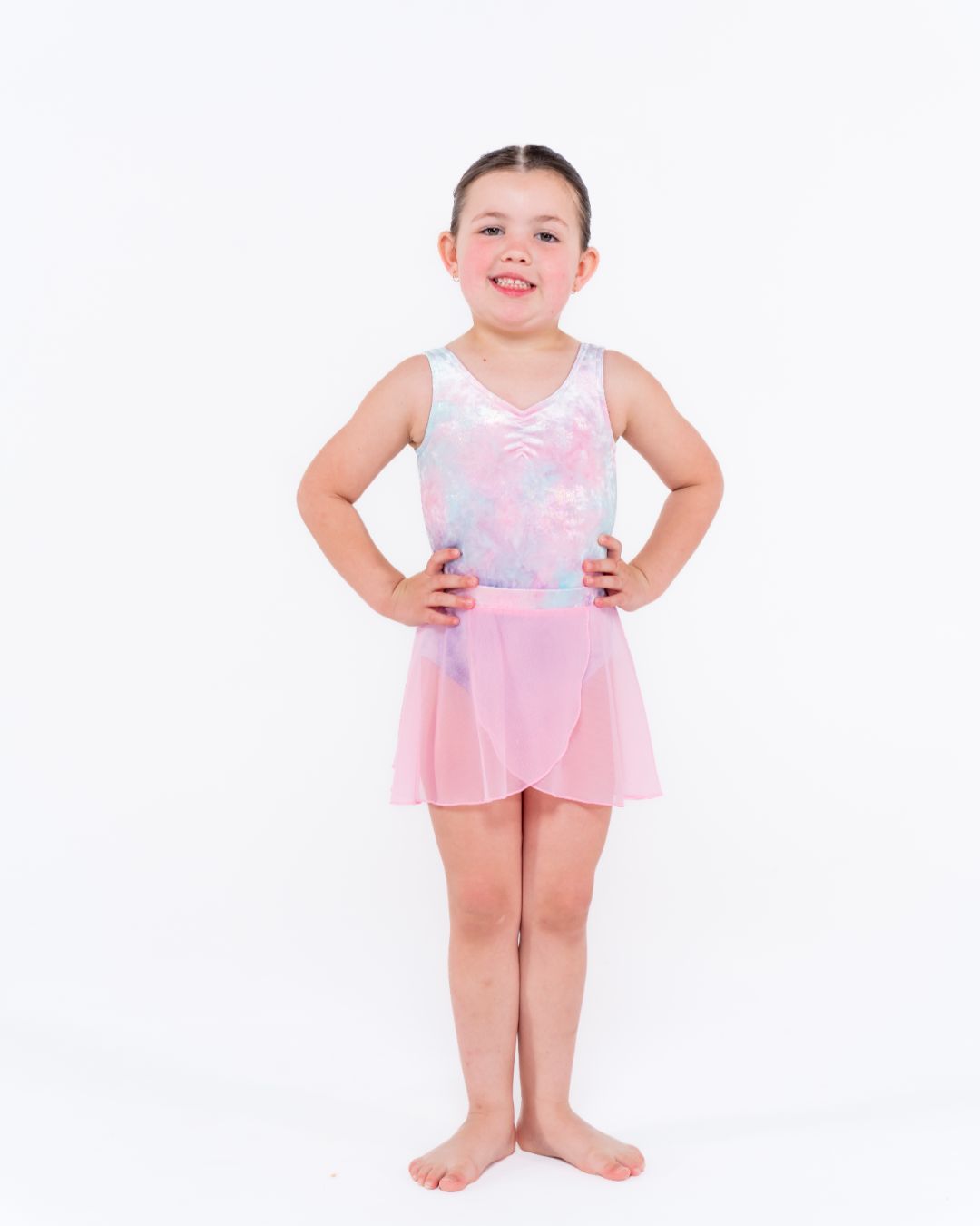 The soft mesh drapes beautifully, creating an ethereal look that every dancer will love. The cross-over front detail adds visual interest while the elastic waistband ensures all-day comfort during practice and performance.