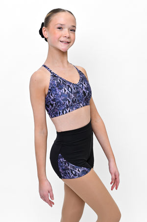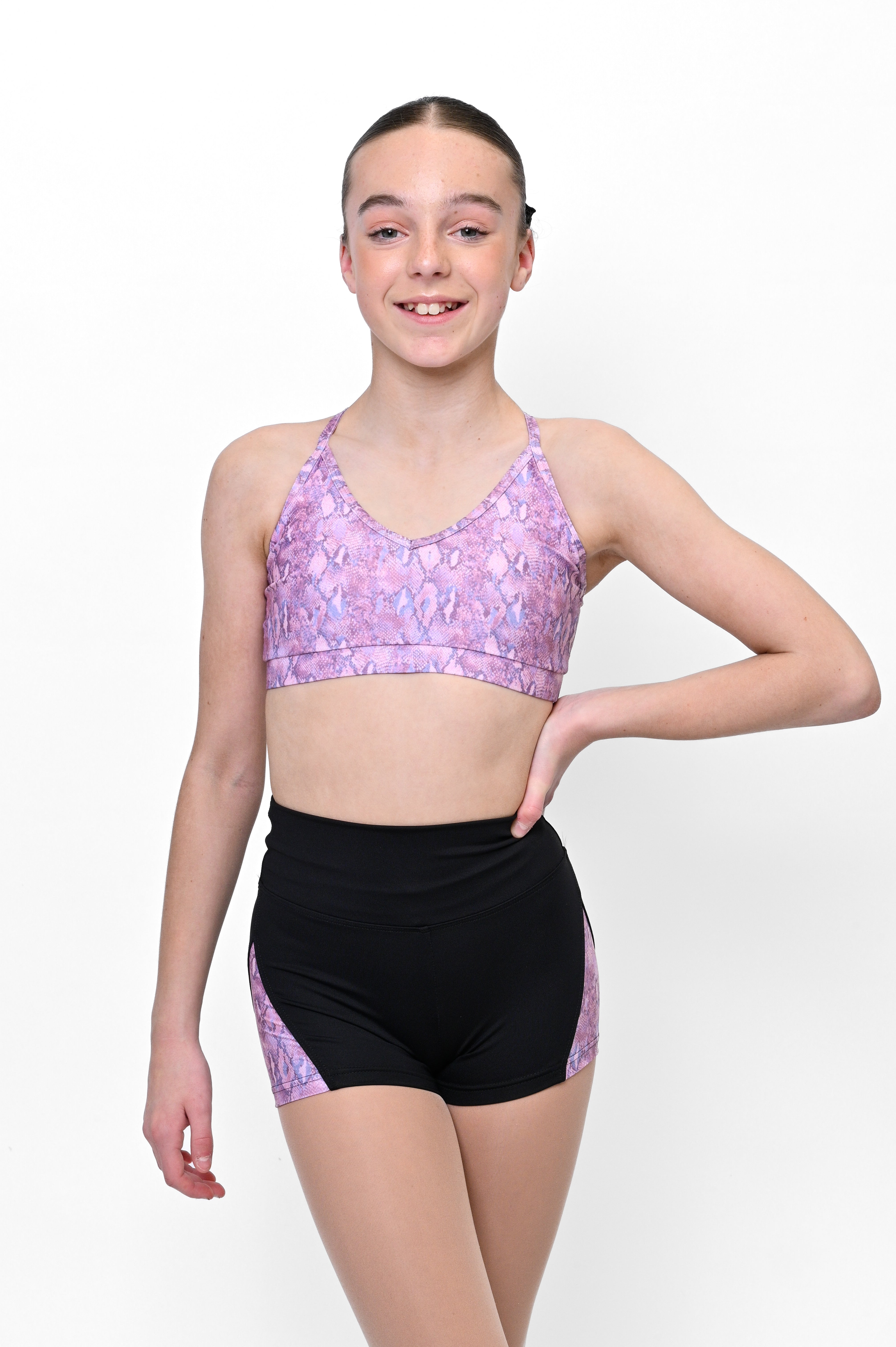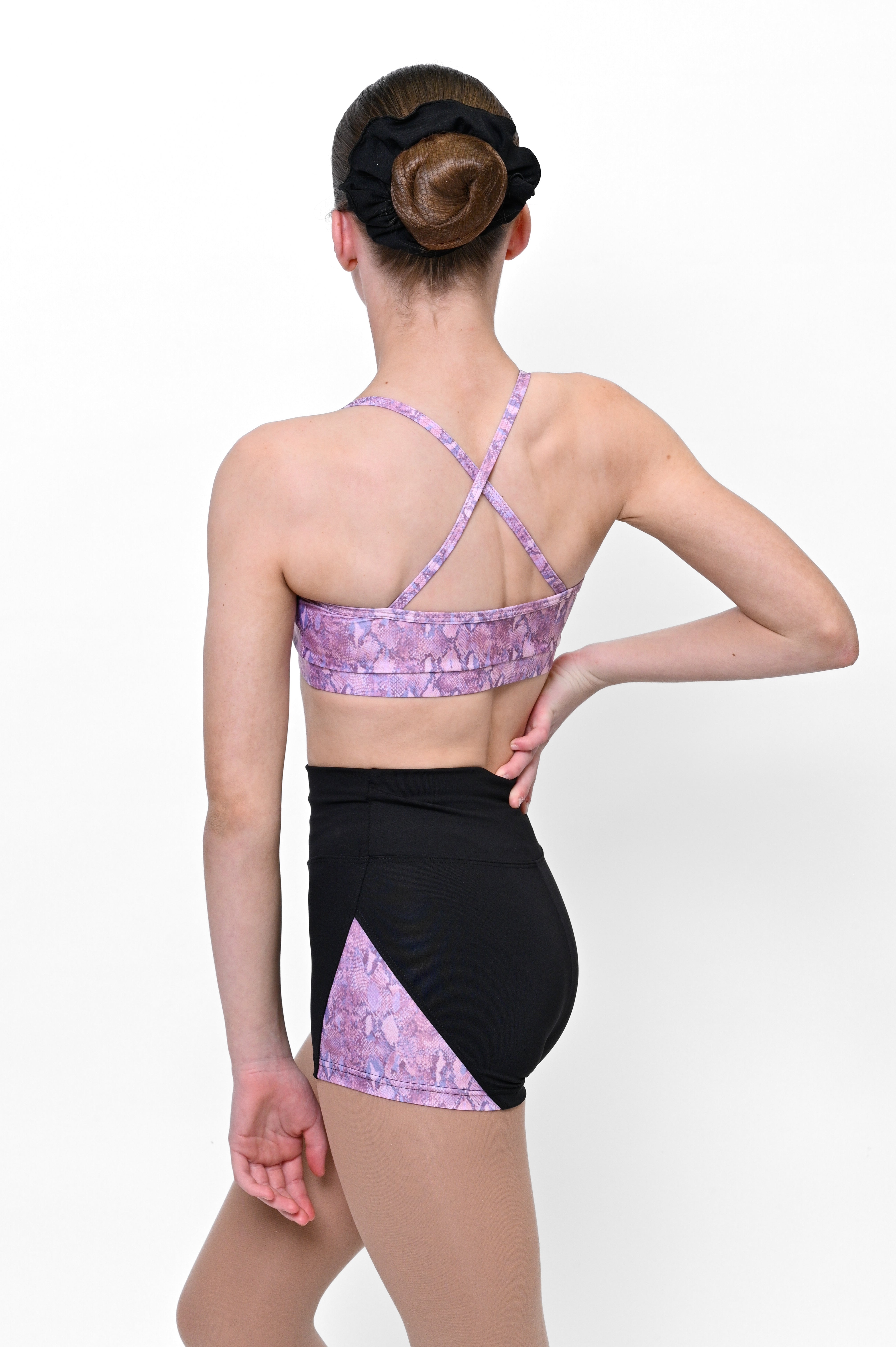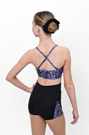 Elevate your look with the Nova Shorts, designed to turn heads in the studio and on stage. With a sleek black base and bold snakeskin splices down each side, these shorts strike the perfect balance between fierce and feminine.