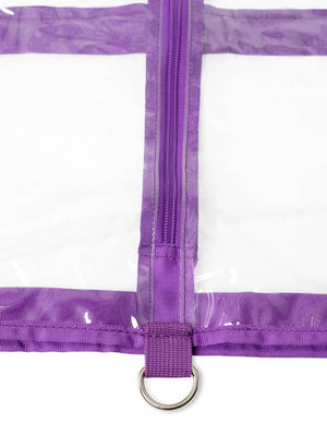 The On The Go Garment Bag is a must-have for dancers who are always on the move. Made from 100% PVC and 100% Nylon, this garment bag is durable and long-lasting. The clear front and back design with coloured trim allow you to easily identify your dancewear and costumes, while the full zipper closure ensures your garments stay in place. The 3" expandable gusset provides extra space for bulkier items, and the 3 outer pockets provide convenient storage for accessories and shoes. Whether you're traveling to a competition or just need to transport your dancewear between classes, the On The Go Dance Garment Bag has got you covered.