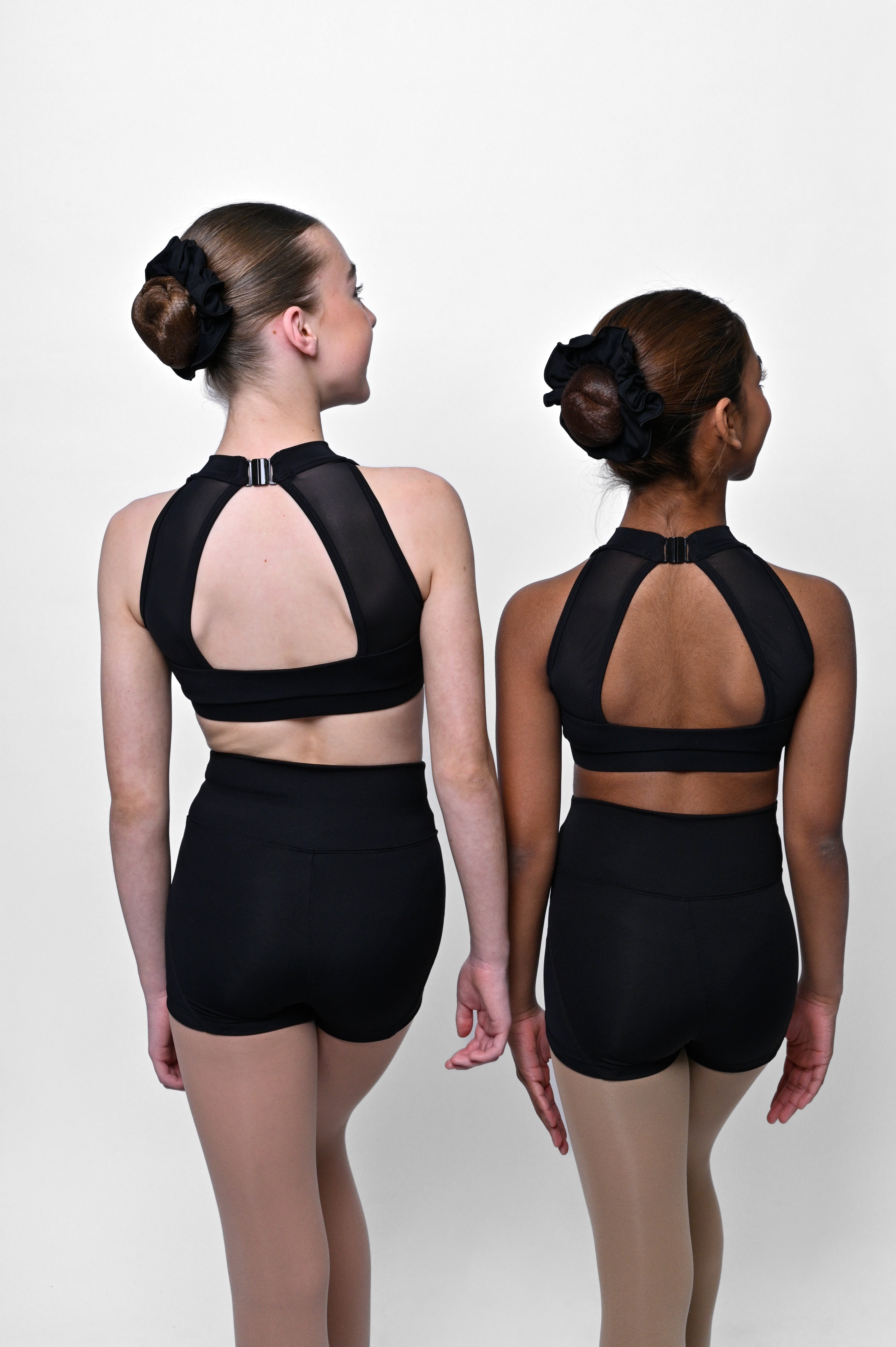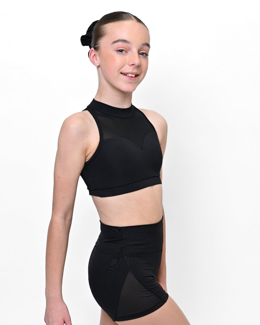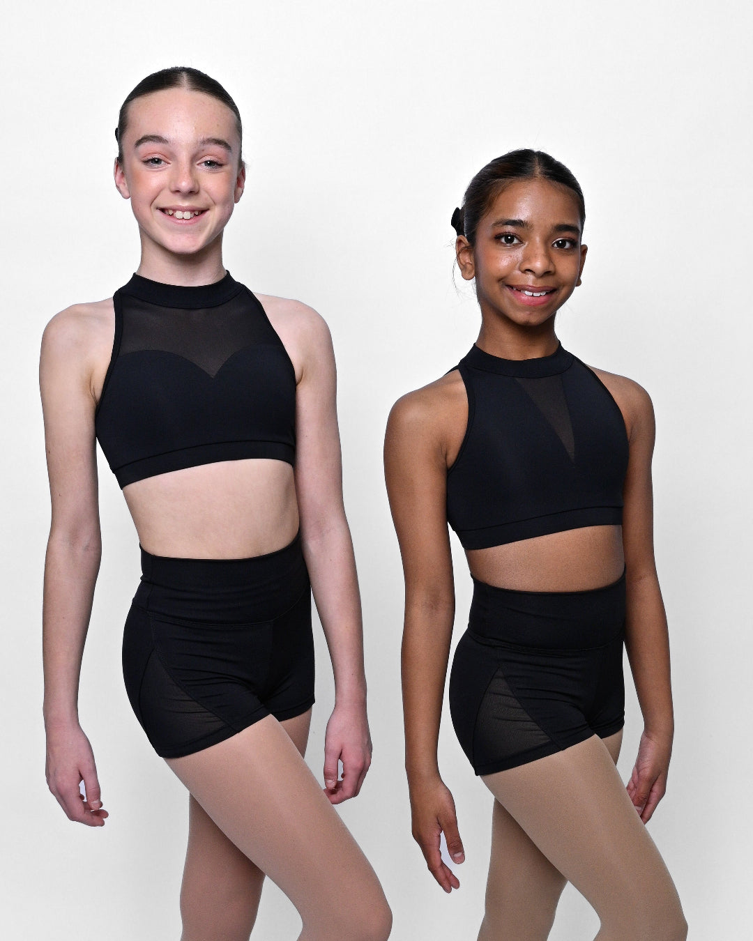 A standout staple for every dancer's wardrobe, the Sophie Crop Top blends bold structure with elegant mesh detailing. The high neckline and romantic sweetheart mesh panel create a striking silhouette from the front, while the back reveals a sophisticated keyhole cut-out framed by mesh and a secure clasp closure. Designed in premium stretch fabric for a flawless fit and lasting comfort.