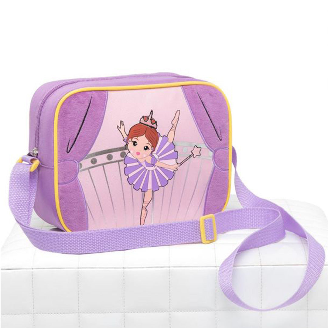 Fun, textured Sugar Plum ballerina print. Adjustable strap to wear over the shoulder. Water resistant and insulated interior. Inner name plate located on the inside back.